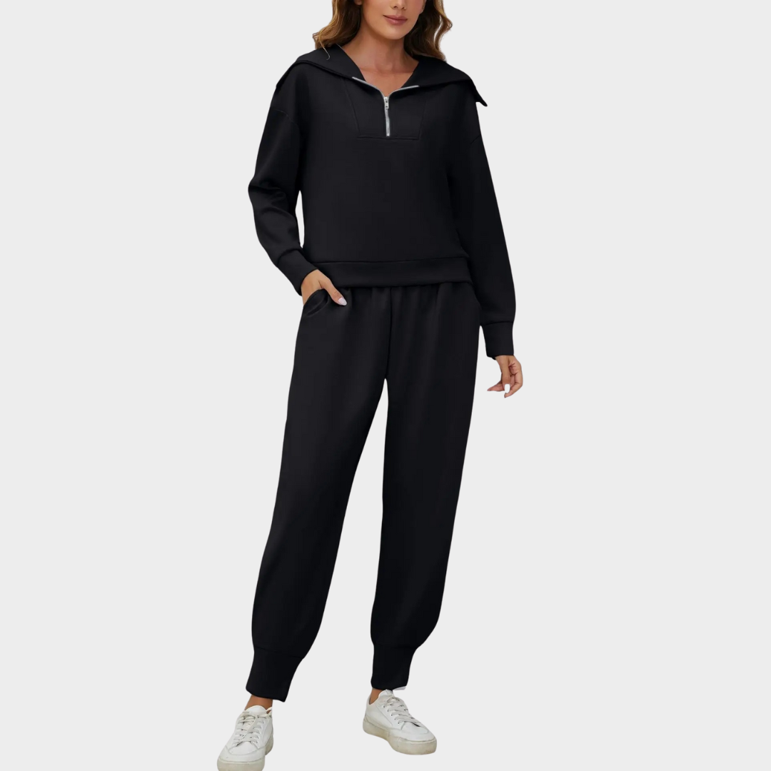 Women’s Black Tracksuit Set – Half Zip Long Sleeve Top and Jogger Pants