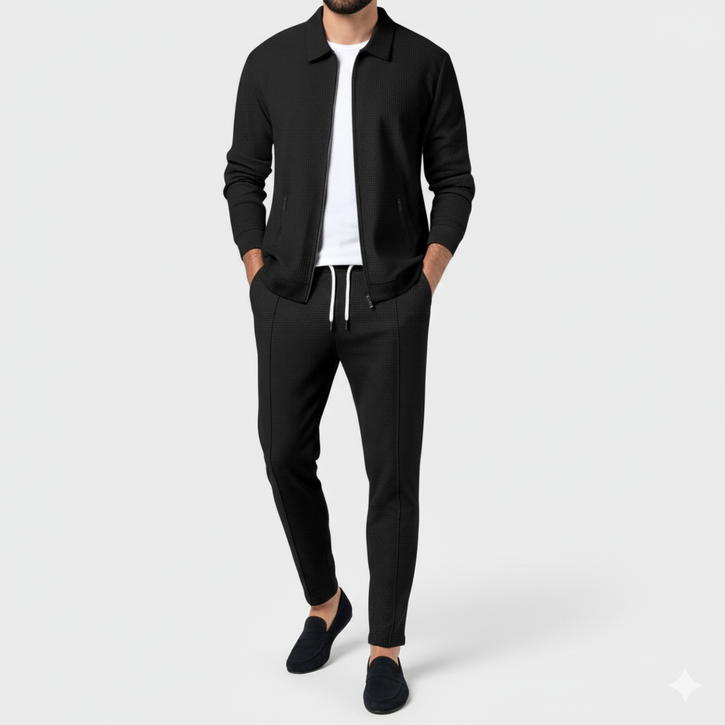 This men's tracksuit includes a full-zip jacket and matching pants. Both pieces are made from a waffle knit material. The jacket features a spread collar and two zippered pockets. The pants have a drawstring waist and two side pockets.