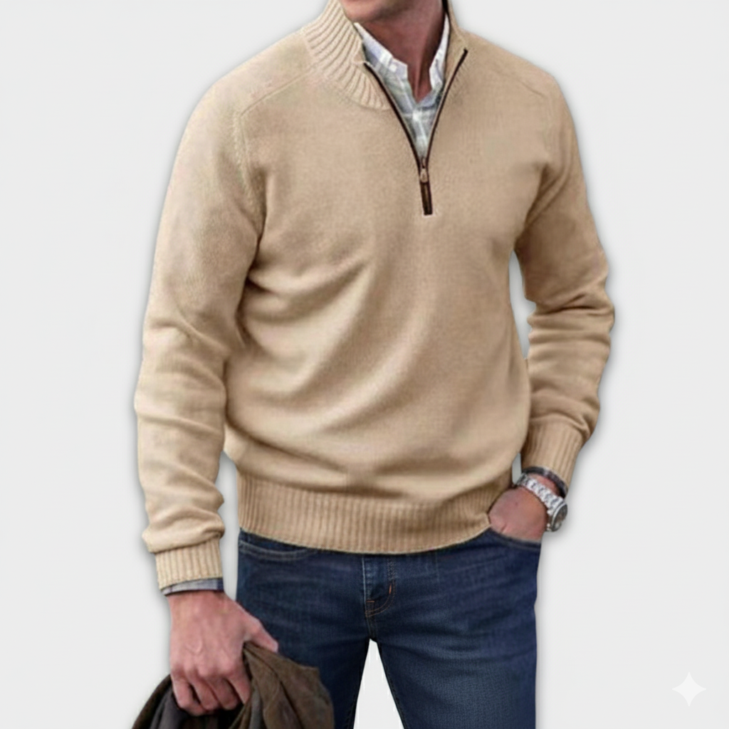 This men’s quarter-zip sweater is designed with ribbed detailing at the collar, cuffs, and hem for a clean, structured look. It is offered in multiple colour options to suit different styles.